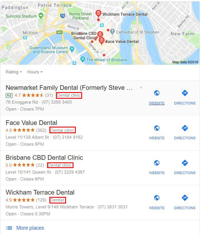 In the example above we can see that most dental practices in Brisbane have themselves categorised as a dental clinic. Feel free to be specific if you primarily provide one type of service.