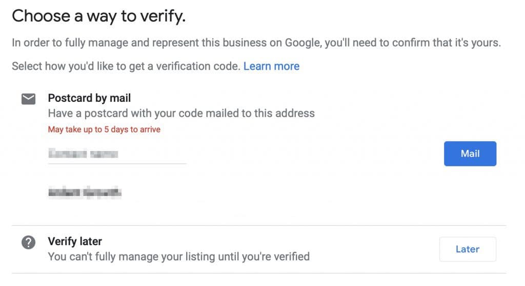 Google may give you a different option to verify your business but for most business owners, you’ll have to wait for a postcard to be mailed to you from Google.